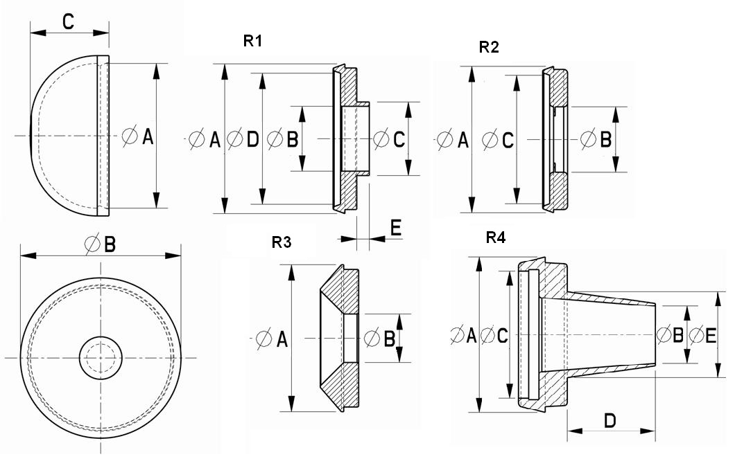 Krytky K1 - použitie pre podložky typov R1, R2, R3 a R4 Rozmery krytky "A" a podložky musí byť zhodné Farba: sivá, hnedá, biela, čierna, podložky - bezfarebné Materiál: PA-6 a LD-PE