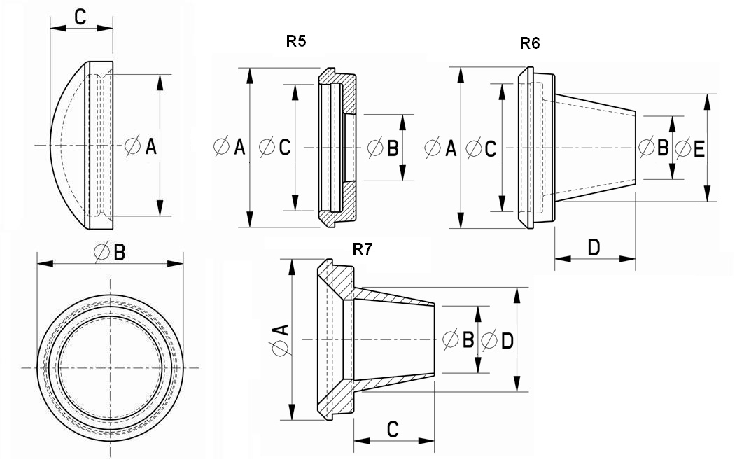Krytky K5 - použitie pre podložky typov R5, R6 a R7 Rozmery krytky "A" a podložky musí byť zhodné Farba: rôzna, podložky - bezfarebné Materiál: HD-PE