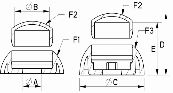 Pre bezpečné, úpravné a korózii zabraňujúce zakrytie hláv skrutiek a matíc Široké využitie na uliciach, ihriskách, v čakárňach, školách a pod. Po montáži neodstrániteľná Kompletný výrobok sa skladá z podložky (F1) a krytky (F2), ktoré je možné kombinovať v rôznych farbách. Vyhotovenie F3 pre samoistiace matice alebo v kombinácii s oceľovou podložkou F4 (Nie je súčasťou dodávky) Farba: zelená, modrá, biela, čierna, červená, žltá Materiál: Polypropylén (PP
