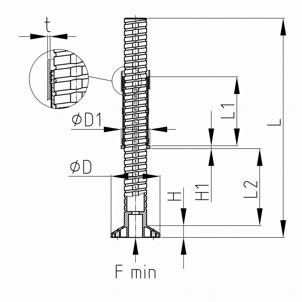 Nastaviteľná záslepka - noha s veľkou aretáciou a sklopnou nôh Farba: čierna Materiál: Polyamid (PA) tvrdený skleným vláknom