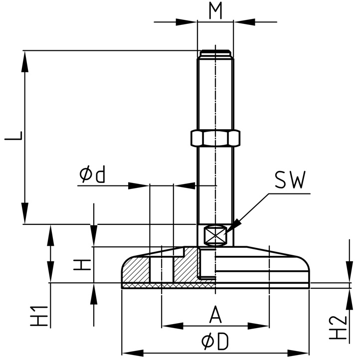 Možnosť protišmykovej podložky (objednávacie číslo s "A"). Podložka nie je pri dodaní prevŕtaná. Protišmyková podložka má silu 3 mm ("H2") Príklady použitia: stroja Materiál: základňa - ušľachtilá oceľ A2 protišmyková podložka - guma (NBR 70 Shore)