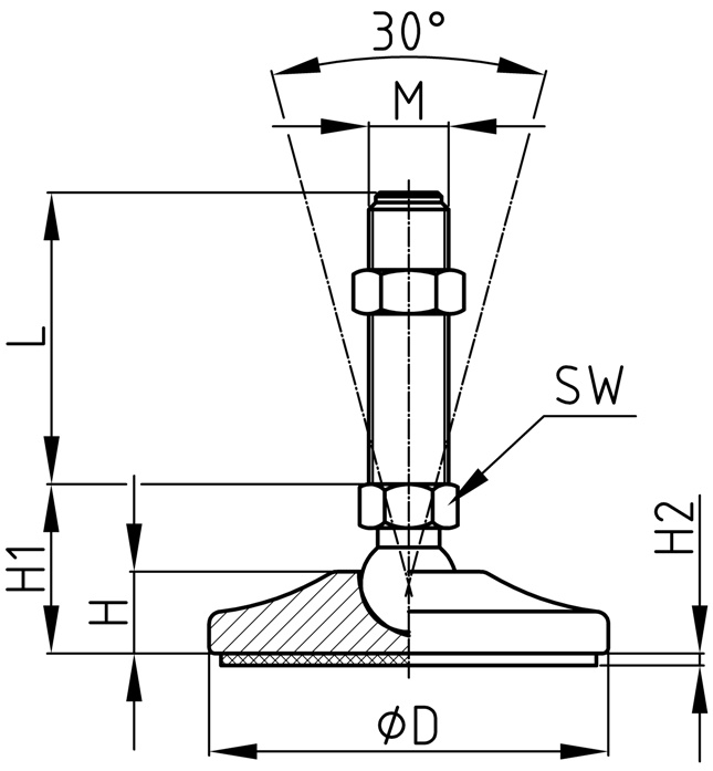 Možnosť protišmykovej podložky (objednávacie číslo s "A") Protišmyková podložka má silu 3 mm (rozmer H2) Príklady použitia: paletovacie stroje, dopravníky, automatizačná technika Farba: žltá RAL 1007 Materiál: základňa - lakovaná oceľ závit - pozinkovaná oceľ protišmyková podložka - guma (NBR 70 Shore)