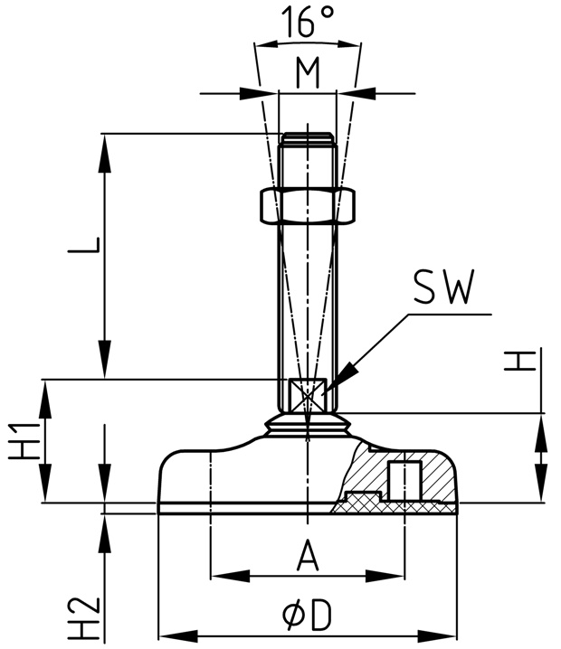 Dosadacia plocha z polyamidu tvrdeného skleným vláknom Možnosť protišmykové podložky (objednávacie číslo s "A") Do dosadacej plochy možno vyvŕtať dva otvory na upevnenie k podlahe Farba: čierna Materiál: základňa - Polyamid (PA) + sklené vlákno závit - pozinkovaná oceľ podložka: nitrilová guma