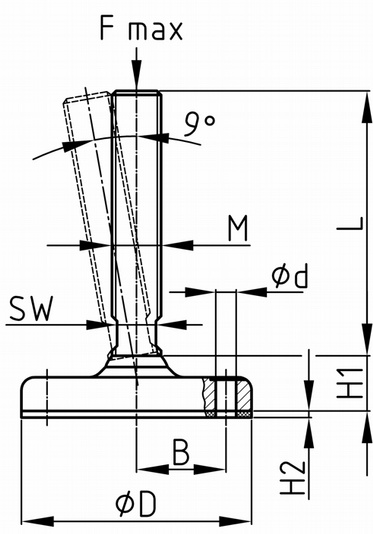 Výkyvná Pre veľké zaťaženie Protišmyková podložka - objednávacie číslo: MFHJ 80G, MFHJ 90G, MFHJ 110G, MFHJ 150G Materiál: základňa - ušľachtilá oceľ A2 závit - ušľachtilá oceľ A2 dosadacia plocha - vulkanizovaná guma (NBR 72 Shore)