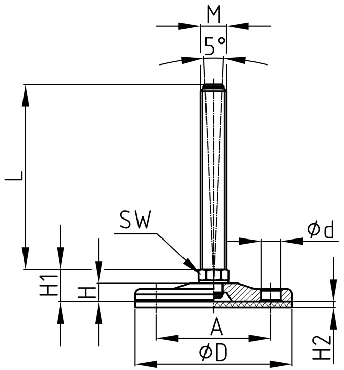 Možnosť protišmykové podložky (objednávacie číslo s "A") Závit je v nohe naskrutkovaný, otočná hlava V protišmykové podložke nie sú otvory pri dodaní vyvŕtané Príklady použitia: paletovacie stroje, dopravníky, automatizačná technika Materiál: základňa - pozinkovaná oceľ protišmyková podložka - guma NBR 70 Shore