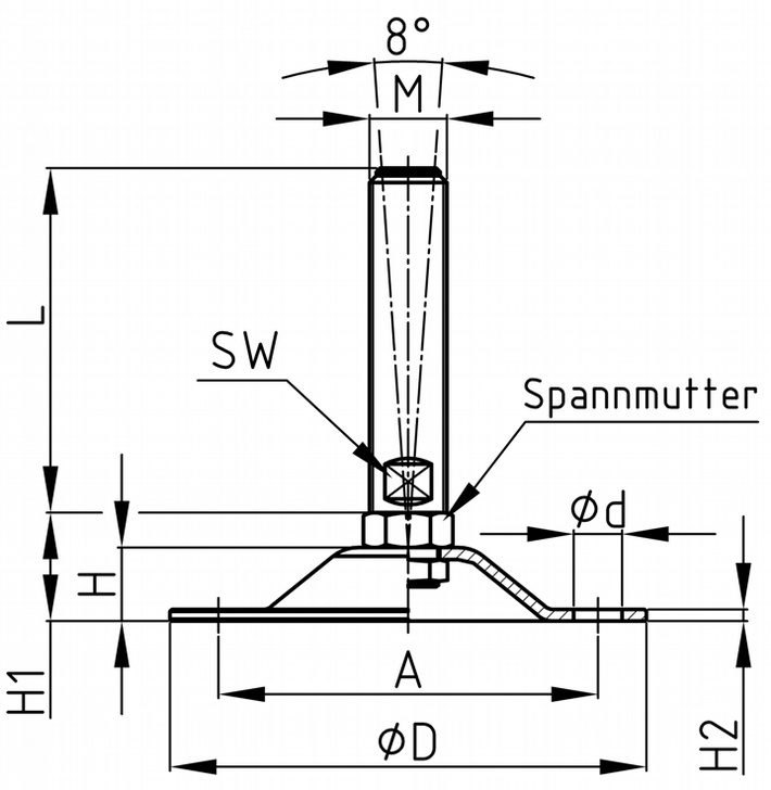 Pätka z lisovaného oceľového plechu So 4 montážnymi otvormi a upínacou maticou Upínacia matica aretuje skrutka pevne s nohou Príklady použitia: paletovací stroje, stroje na spracovanie dreva, výrobné stroje všeobecne Materiál: základňa - lisovaná pozinkovaná oceľ závit - pozinkovaná oceľ
