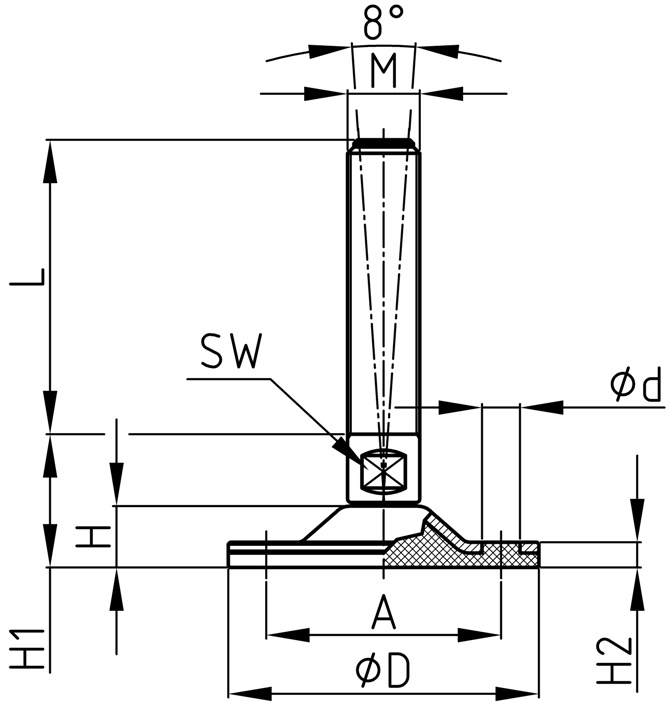 S 2 alebo 4 montážnymi otvormi Dosadaciu plochu z vulkanizovanej gumy možno prevŕtať a priskrutkovať k podlahe Priemer nohy 85 mm - 2 montážne otvory, priemer 123 mm - 4 montážne otvory Príklady použitia: paletovací stroje, stroje na spracovanie dreva, výrobné stroje všeobecne Materiál: základňa - ušľachtilá oceľ A2 závit - ušľachtilá oceľ A2 dosadacia plocha - vulkanizovaná guma (NBR 80 Shore)