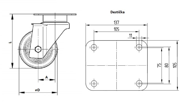 Uchytenie s doštičkou (137 x 105 mm) Teplota: - 20 ° C / + 60 ° C Presné guľôčkové ložisko v hlave otoče Štandard: EN 12532 Materiál: Stred kolieska - hliníková zliatina Vidlica kolieska - silný plech (modro pozinkované) Behúň - Polyuretán, tvrdosť - Shore A 92, presné guličkové ložisko