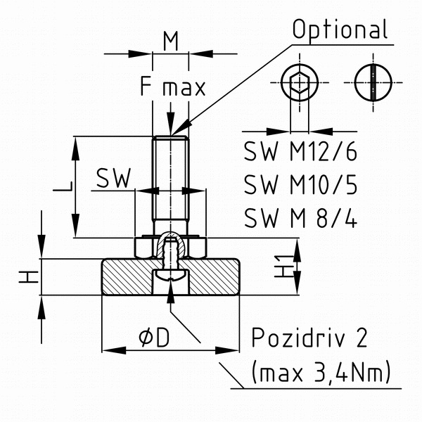 Nastavovacia skrutka s otočnou plastovou hlavou Možnosť imbusu (ISK, rozmery M 8 / SW 4, M10 / SW 5) Príklady použitia: podnože pod stoly, kovové konštrukcie, ukotvenie balkóna Farba: čierna Materiál: základná priemer 20/25 mm - Polyamid (PA) základňa priemer 30/40 mm - Polypropylén (PP) závit - DIN 588-4,6-A2F pozinkovaný