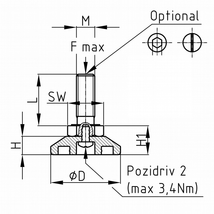 Nastaviteľné nožičky so šesťhrannou nastavovacou skrutkou (otočná základňa), plastová hlava Možnosť imbusu (ISK, rozmery M10 / SW 5) Príklady použitia: podnože pod stoly, kovové konštrukcie, ukotvenie balkóna Farba: čierna Materiál: základňa - Polyamid (PA) závit - DIN 588-4,6-A2F pozinkovaný