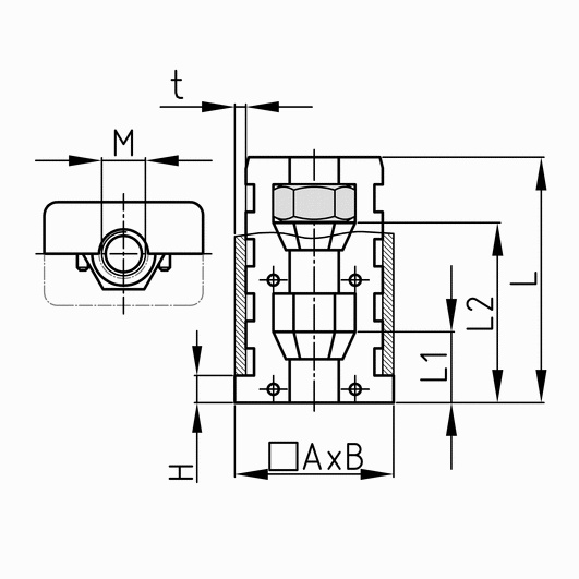 Záslepka do jaklov (zostaviteľná) so šesťhrannou maticou (vzadu) Dvojdielne puzdro s obímkou má kužeľové komory pre šesťhranné matice alebo skrutky Pri uťahovaní závitu sa vonkajšia stena záslepky tlačí na vnútornú stenu rúrky (hmoždinkový efekt) Farba: čierna Materiál: telo - Polyamid (PA) matice - pozinkovaná oceľ